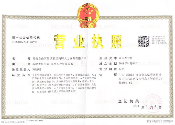 2021年新年上班第一天,在长沙经开区行政审批大厅,湖南自贸区首家人力资源公司——湖南自由贸易试验区简聘人力资源有限公司正式注册成立,并入驻长沙经开区人力资源服务产业园。